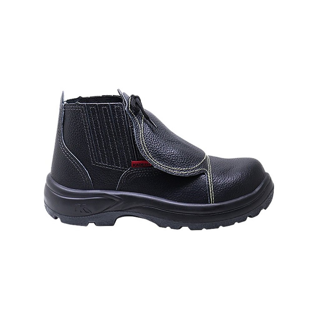 Botina metatarso externo Kadesh, linha Premium, em couro vaqueta, preta, com protetor de metatarso externo em polipropileno (PP) e solado em poliuretano bidensidade.
